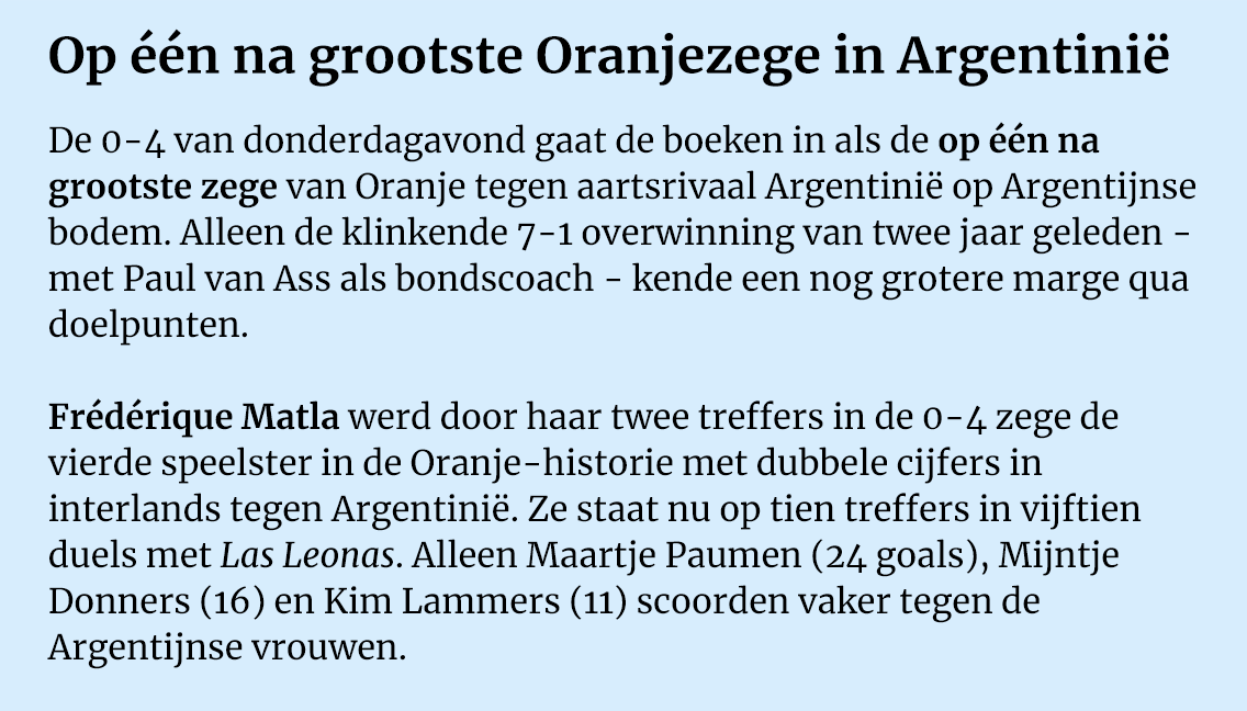 Het rendement moest omhoog. En tegen wie test je dat beter dan tegen de nummer twee van de wereld? In het stadion van de aartsrivaal nog wel. De perfecte proef voor Oranje, waar ditmaal Marijn Veen de aanvoerdersband droeg. Van Ehrens vaste selectie bleef Pien Sanders thuis: de verdedigende middenvelder was niet fit genoeg voor de trip naar Argentinië, maar sluit naar verwachting in januari weer aan. Tegen Duitsland nam Renée van Laarhoven de honneurs waar, donderdagavond stond Veen voor het eerst als captain op het formulier.