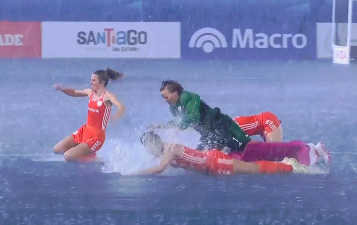 Vierenhalve minuut voor tijd werd het spel zelfs stilgelegd: het was onmogelijk om de bal van A naar B te krijgen. Na wat beraad – en waarschijnlijk een blik op de Argentijnse buienradar – klonk het eindsignaal. Vier of vijf goals maken in nog geen vijf minuten? Daar hadden de Argentijnen geen tijd meer voor. Om de overwinning te vieren, besloten de toch al compleet doorweekte Xan de Waard, Luna Fokke, Marleen Jochems en Veenendaal de avond af te sluiten met een zeiknatte buikschuiver.