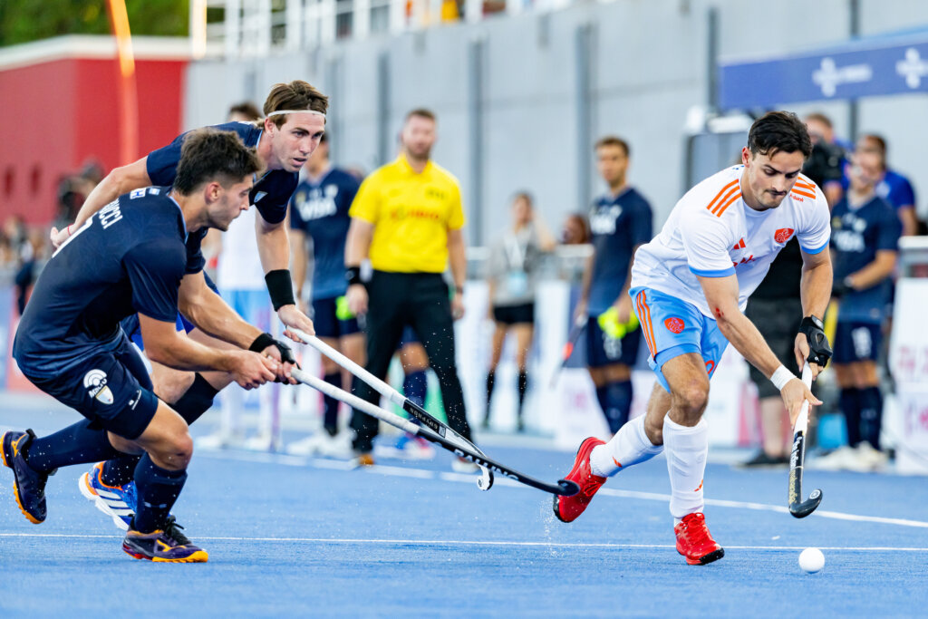Terrance Pieters probeert de pass van Ignacio Ibarra te blokken. Foto: Worldsportpics/Martin WaichmanOranje begon energiek. Argentinië ving de tegenstander op de eigen helft op. De eerste kansen waren dan ook voor de Nederlanders. Na een Argentijnse interceptie belandde de bal voor de stick van Tijmen Reyenga. De verdediger van Oranje-Rood haalde direct uit, maar doelman Tomas Santiago bracht knap redding. Even later raakte Justen Blok uit de tweede Nederlandse strafcorner het houtwerk. Het overwicht leverde echter geen doelpunt op.